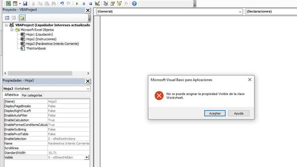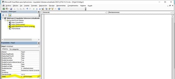 Tengo un libro de excel y necesito desbloquearlo completamente, ya habilite la hoja1 liquidación y la hoja2 instrucciones. Pero la hoja3 parámetros de intereses corrientes me ha sido imposible me pueden ayudar. Cuando la intento habilitar la propiedad visible y ponerla en 1 no deja.
