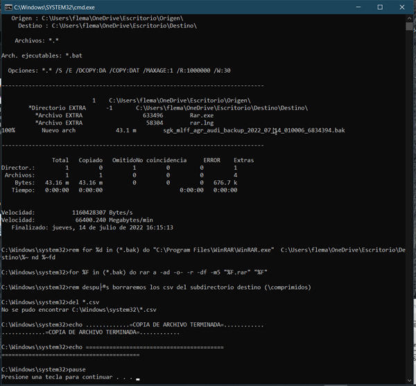rem copia de la base robocopy H:\origen H:\destino1 /E /MaxAge:1 /xf *.Bases_de_datos_procelec rem compresion for %%F in (*.bak) do "C:\Program Files\WinRAR\WinRAR.exe" a -ad -o- -r -df -m5 "%%F.rar" "%%F" rem copia del archivo comprimido al destino fianl robocopy H:\destino H:\Carpeta_backup /MOVE /MaxAge:1 /xf *.bat