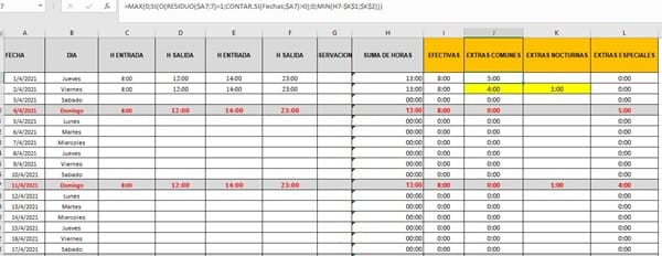Favor necesito una fórmula para que me calcule horas extras nocturnas y le vaya restando a las horas extras comunes o a las horas extras especiales en su defecto.