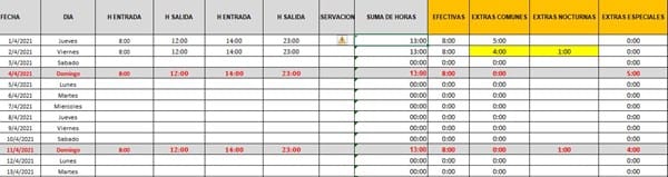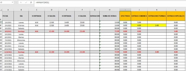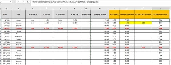 Fórmula excel para horas extras nocturnas de 22 a 06