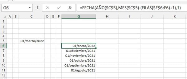 Tengo en la casilla C5 una determinada fecha (mes y año) y quiero que al introducir la fecha en esa casilla automáticamente mediante macro me genere a partir de la celda G6 seis meses anteriores, pero comenzando por el segundo mes. Es decir si la casilla en c5 tengo marzo de 2022, debe generar los seis meses anteriores a partir de enero de 2022.
