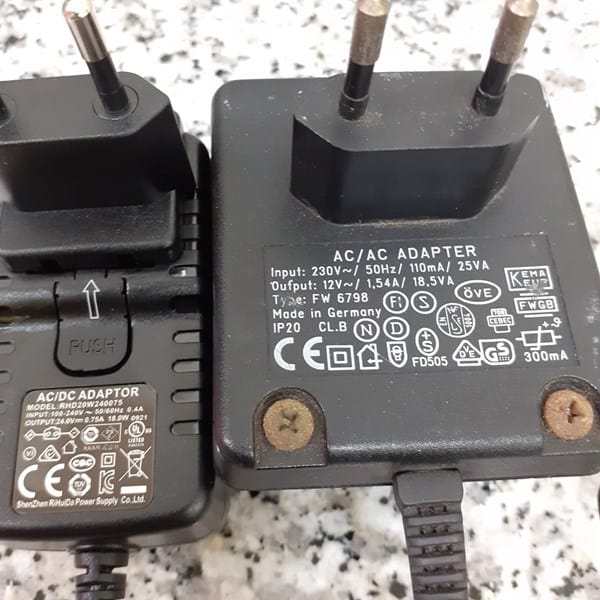 Tengo una curiosidad que me surgió ayer cuando encontré dos tomas a corriente una con la indicación AC/AC ADAPTER, y la otra con la indicación AC/DC ADAPTOR. Ambas tienen una conexión que físicamente encaja que conecta con un viejo equipo electrónico (es una conexión que ahora no se ve mucho, creo yo, muy pequeña y con forma de T).
