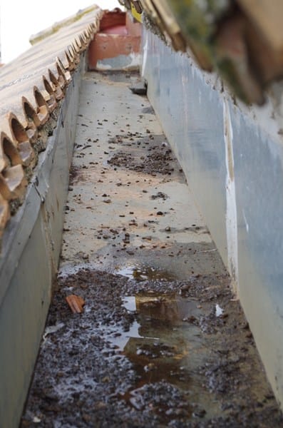 Vivo en el último piso de un edificio. El tejado tiene el canalón oculto. Donde acaba la parte de fachada que está sobre mi piso (la mitad del edificio), el canalón tiene un "tabique" o chapa de metal que separa el canalón en dos partes. Una (la que está en mi piso) con una sola bajante para medio edificio. La otra, con tres bajantes para el otro medio.