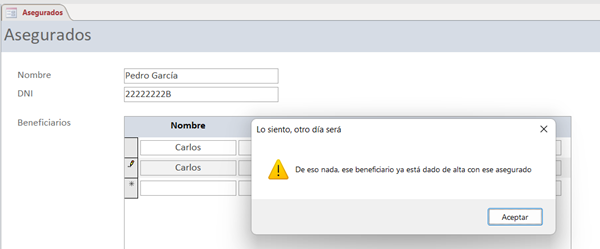 Entonces mi pregunta es. ¿Cómo puedo hacer para que en el formulario solo tenga en cuenta que si se pone el mismo nombre, apellidos y fecha nacimiento no te deje meter el registro y te avise que ya está registrado ese asegurado?