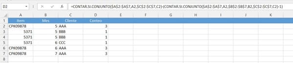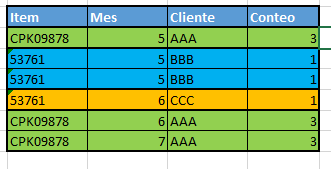 Como se puede ver en la imagen, en azul un mismo datos se repite 2 veces pero en función de mes su conteo es 1, en verde el dato se repite 3 veces ya que en función del mes se realizo en 3 meses diferentes.