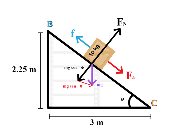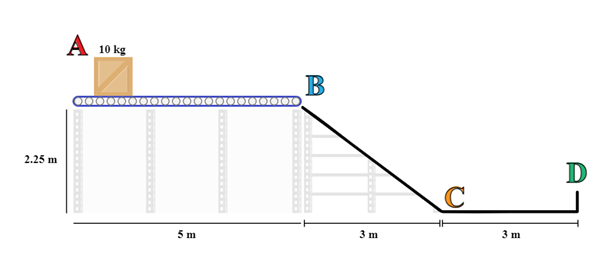 En una fábrica se trasladan cajas de 10 kg en una banda transportadora que se mueve a una rapidez constante de 1 m/s. Al final de la banda se encuentra una rampa que llevará la caja hasta el punto D. El coeficiente de fricción cinético entre las superficies en la rampa es de 0.38. Las dimensiones de la banda y la rampa se muestran en el diagrama siguiente: