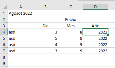Sumar las 3 columnas Día, mes y año de la celda A1 y quiero un fórmula para el resultado es 2 corresponde Agosto 2022