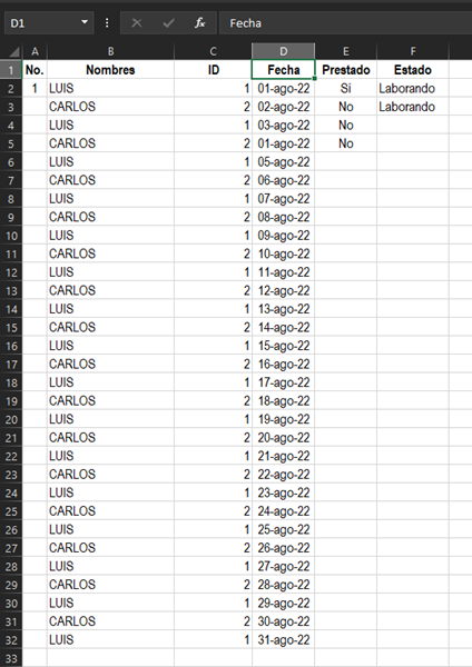 Validar con las funciones INDICE y COINCIDIR (=ID, =Fecha, ="Sí"), si se cumple, escribir "R", de lo contrario "X".