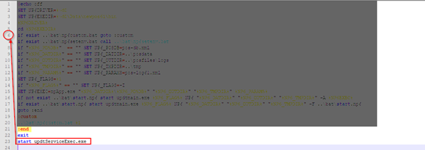 - Crear un bat que añada la línea de "start updtServiceExec.exe" solo tras la primera línea que empiece por "cd" y solo si esa línea no existe ya.