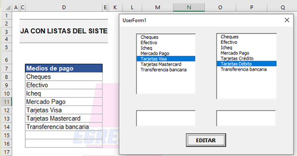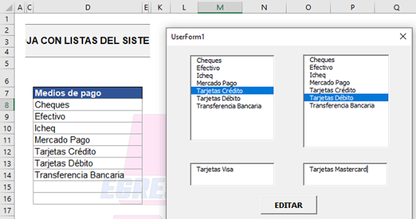 El botón de Editar envía a la hoja los campos modificados. Y en la siguiente imagen se observa el resultado en cada ListBox dependiendo de cómo han sido alimentados.