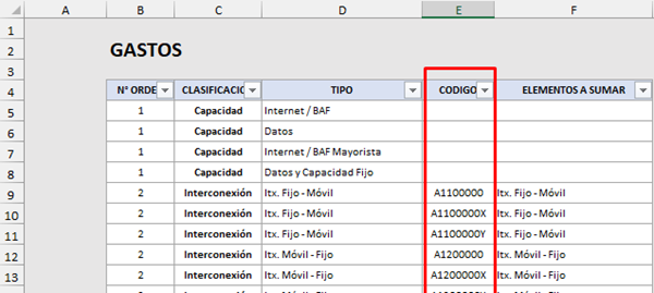 GASTOS: es una hoja dentro del libro del formulario que tiene códigos de gastos.