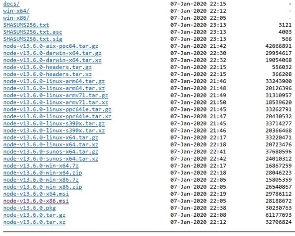 **En el segundo enlace, (https://nodejs), la descarga correcta creo sería la cuarta empezando por abajo, marcada en morado, aquí puede verla,