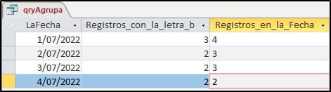 Quiero realizar una consulta de totales que, entre un período de fechas, me indique los valores específicos de un campo y el total de registros por es fecha. Es decir por ejemplo, que entre las fechas 01/01/2022 al 05/01/2022 me cuente los registros de un campo que contengan el caracter b del total de registros por fecha. El resultado que necesito sería el siguiente: