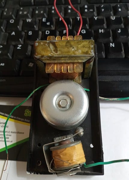 La situación eléctrica es la siguiente. Los dos cables rojos que salen del transformador son de 220 V alterna. La salida de ese transformador reduce la tensión, quizá a 12 V alterna pero da igual la cifra. Esa salida un cable va al pulsador y la salida del pulsador va a la entrada del zumbador que es la pieza de abajo. La otra salida del transformador va directamente al zumbador con el cable que falta para cerrar el circuito. Y ya esta. Tocas el timbre y cierras circuito zumbando y vibrando la pieza que toca la campanilla. Sera un timbre continuo mientras estés pulsándolo a modo de como sonaba los teléfonos de mesa de casa pero en continuo. La pega de ese sistema era que podías estas con el dedo pulsado y tocando y podrías quemar la bobina si te quedaras pegado el dedo al pulsador con mucho tiempo de pulsación.