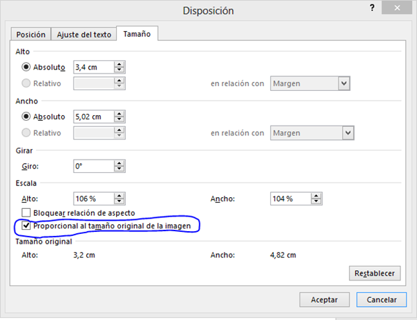 Desmarcar la opción de "proporcional al tamaño original de la imagen" visual basic en word