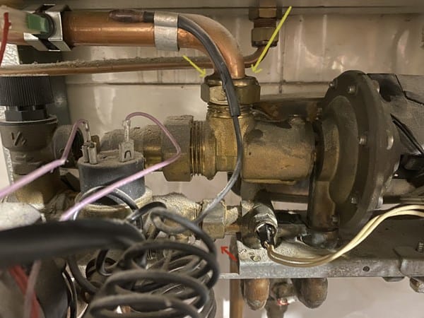 -Pequeña fuga por el tubo que conectan con la sonda control de temperatura a.c.s (ver fotografía 2 con marcador rojo)