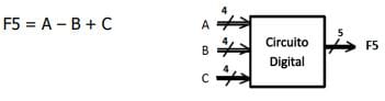 b) El circuito digital recibe las palabras binarias A, B, C de 4 bits cada una, y presenta en F5 la siguiente función aritmética: