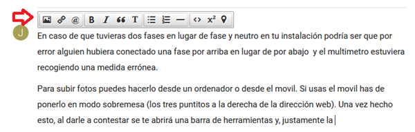Para subir fotos puedes hacerlo desde un ordenador o desde el móvil. Si usas el móvil has de ponerlo en modo sobremesa (los tres puntitos a la derecha de la dirección web). Una vez hecho esto, al darle a contestar, se te abrirá una barra de herramientas y, justamente el botón de la izquierda, unas montañitas, será el que te permita localizar y subir las fotos.