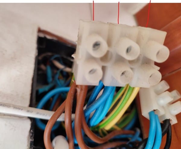 Hola, duda básica sobre conexiones electricas, pido perdón de antemano por mi ingnorancia en estos temas. Quería poner un enchufe extra en la cocina en lugar de una toma de telefóno totalmente inútil. Cambien el conector y el embellecedor sin problema y a la hora de conectar los 3 cables, marrón, azul y tierra es donde tengo la duda. Por encima de la toma hay esta caja de la imagen, con una porrá de cables y un tubo que baja a la toma en sí. Para conectar el nuevo enchufe intenté conectarlos a la parte baja de ese conector triple, pero no tengo espacio para meter más cables ahí, he probado a a sacar uno incluso y roscar el nuevo en cada caso con el antiguo y ya no entran más. Se me ha ocurrido conectarlos por arriba (marco en rojo), así lo he hecho y el enchufe funciona, pero igual he hecho una barbaridad, esa es mi pregunta. Por otro lado los cables que que me vendieron son un poco más finos que estos que se ven aquí, ... Igual para enchufe es necesario ponerlos de ese grosor. Me preocupa que haya puesto mal el enchufe y que de problemas en el futuro.