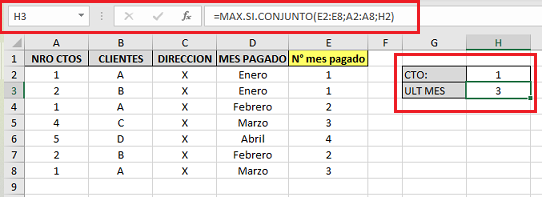A numero de los contratos, B los clientes, C dirección, D los meses pagados
