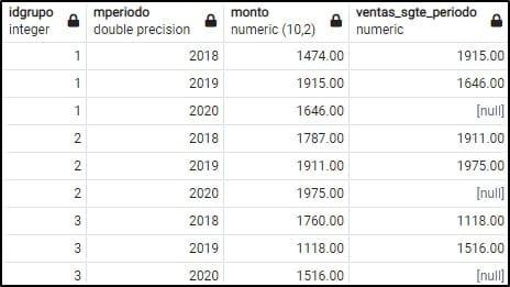 Primero que todo lo felicito Hernán por utilizar PostgreSQL como Back End, es un gran acierto. La instrucción que explican le sobra un paréntesis en And (Year(fecha)<2020 y NO es la respuesta porque la información ya está agrupada por idgrupo y fecha, lo que solicitan es "... obtener en una columna el monto del siguiente período de acuerdo con el grupo". Asumo por esto se hace en PostgreSQL por la dificultad.