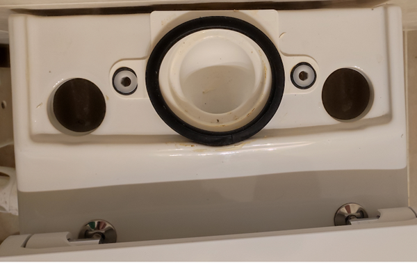 Si veis la foto, el acople de la taza tiene una pieza atornillada de plástico extraña, que tiene una rebaba interior, como si allí tuviera que ir otra junta (que no está) . La que me pusieron originalmente queda totalmente por fuera, y la del kit nuevo también, y además como es tan "esponjosa" y el agujero interior tampoco tiene exactamente el mismo diámetro del agujero de la taza - la junta en una parte queda en voladizo respecto al agujero, al calzar el tanque supongo que se deforma y se abre, ya que una parte se "hunde" en el propio agujero. Un desastre.