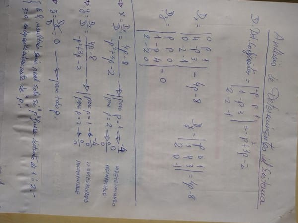 Primera fila- p = 0, 3, 4, etc. - rangos de numerador y denominador iguales. Solución única. Serían tres planos que se cortan en un punto determinado.