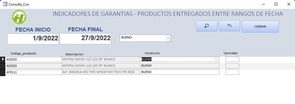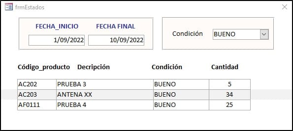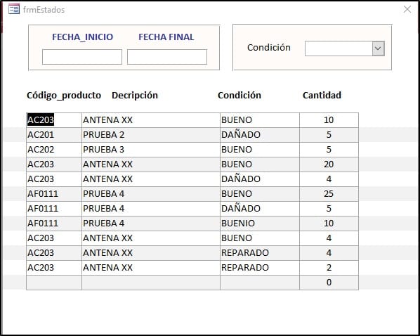 Tengo un formulario de consulta donde coloco un rango de dos fechas adicional debo colocar un código de producto y seleccionar una condición, esto con el fin de buscar cuantas veces ha ingresado un código según una condición (BUENO, DAÑADO, REPARADO, SIN GARANTÍA) entre un rango de fecha, anexo la pantalla: