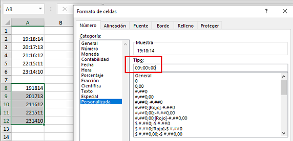 Tengo una columna con horas, pero en formato " 191814" y lo necesito en "19:18:14. En una de las preguntas de este foro, he encontrado una muy buena respuesta, pero el problema es que tal y como está creada, solo puedo introducir los datos uno a uno, en el momento que pego en la columna mas de una celda, me da error, por exceder el límite de dígitos. ¿Cómo podría hacerlo para pegar una columna de datos de este tipo y poder pasarlo al otro formato?