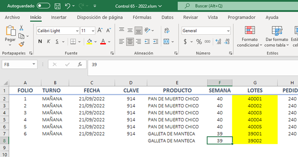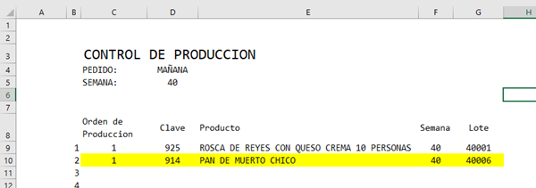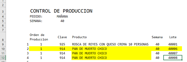 Como se puede dar cuenta, el producto "pan de muerto chico" ya existe mi en base de datos, de la semana 40 y llego hasta el lote 40005, ahora si en mi hoja "reporteimpresion" quisiera solicitar otro lote este me debería leer que en mi base ya existen 5 lotes anteriores por lo que el que sigue es el 40006