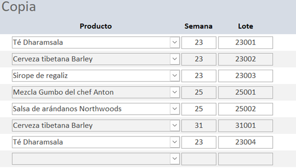 En la columna E tengo los productos, en la F la semanas y en la G los lotes por oden consecutivo conformo lo he solicitado en mi archivo