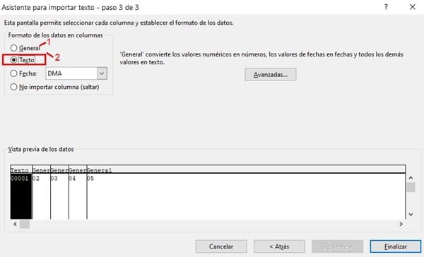 Cuando abres un archivo txt, en el paso 3 de 3, para conservar los ceros, debes seleccionar la opción "Texto", es la opción 2