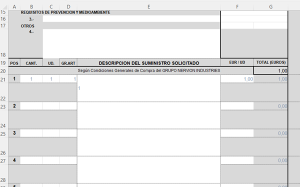 Sub Detalle_sdc() Dim NombreHoja As String Dim HojaDestino As Range Dim NuevaFila As Integer Dim FilasFactura As Integer Dim i As Integer Dim j As Integer Dim NumFactura As Integer NombreHoja = "DETALLE SDC" FilasFactura = Application.WorksheetFunction.CountA(Range("Datos_sdc[DESCRIPCION]")) NumFactura = ThisWorkbook.Sheets("SOLICITUD DE COMPRA").Range("G3").Value With ThisWorkbook.Sheets(NombreHoja) For i = 1 To FilasFactura Set HojaDestino = ThisWorkbook.Sheets(NombreHoja).Range("A1").CurrentRegion NuevaFila = HojaDestino.Rows.Count + 1 .Cells(NuevaFila, 1).Value = NumFactura For j = 0 To 7 .Cells(NuevaFila, j + 2).Value = ThisWorkbook.Sheets("SOLICITUD DE COMPRA").Cells(21 + i, 1 + j) Next j Next i End With End Sub