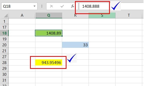 En una celda de una determinada hoja -en concreto la Q18, siendo ser exactos- está dispuesto el valor numérico 1408,888, aunque 'visualmente' y redondeándolo Excel muestra el guarismo 1408,89.