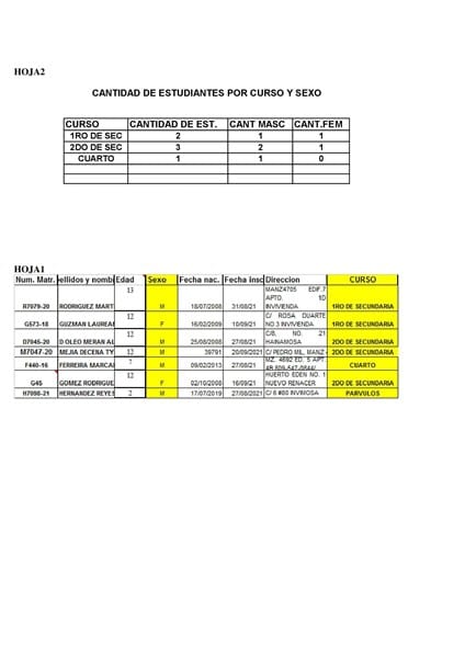 Tengo una base de datos de estudiantes con matriculas asignadas y deseo que la macro me cuente la cantidad de estudiantes que hay en cada curso según el sexo. Ej. En el 1ro curso hay (5 masculino (M)/3 femeninas(F)