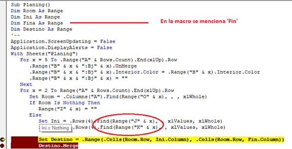 Linea error: Set Destino = .Range(.Cells(Room.Row, Ini.Column), .Cells(Room.Row, Fin. Column))