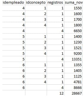 'Obtiene el subtotal por empleado de la columna idconcepto y el total general