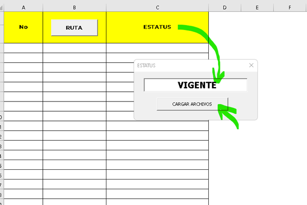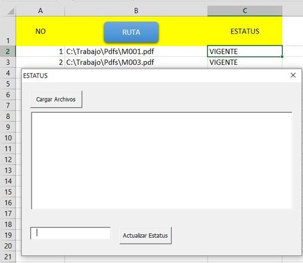 Resulta que tengo una pequeña tabla en la cual adjunto en la columna B la ruta de unos archivos, esa parte no tengo mayor problema sin embargo quisiera llamar un formulario con un textbox antes de cargar la ruta de los archivo para ingresar el estatus que presentan estos mismo y que se vaya llenando la columna del estatus segun las rutas que vaya cargando