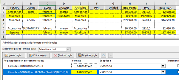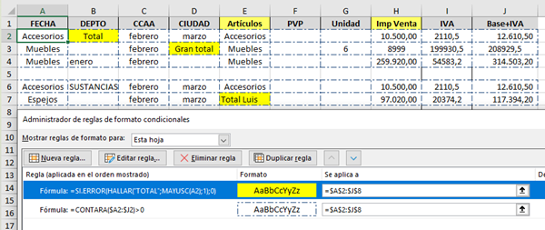 Y lo que también trato en dicha hoja de Excel, es que cuando aparece la palabra Total (Total General, Total Luis, Total Fran, General Total, etc), es decir, desde que haya la palabra Total automáticamente sombree toda la fila.
