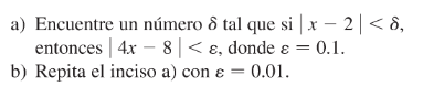 Encuentre un numero δ tal que si |x-2|<δ,entonces |4x-8|<ε=0.1 repita el enciso a