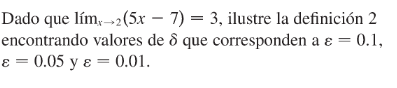 Lím (x->2) (5x-7) = 3; Si y sólo si: 0< |x-2| < δ ; y 0< |(5x-7)-3| < ε.