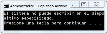 No te preocupes, yo también estoy jubilado. Y me gustan los quebraderos de cabeza. Me parece que tal vez no me expliqué claramente al hablar de lo que debías teclear. Quería que teclearas de uno en uno los comandos de la primera ventana, a ver si en algún caso salía el mensaje de error "El sistema no puede escribir..." y me contaras que ocurre con cada uno de ello.
