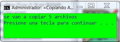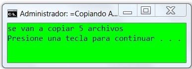 @echo off title=Copiando Archivos MP3 set nlin=4 set ncol=40 mode con cols=%ncol% lines=%nlin% Echo SE VAN A COPIAR %1 ARCHIVOS Pause exit