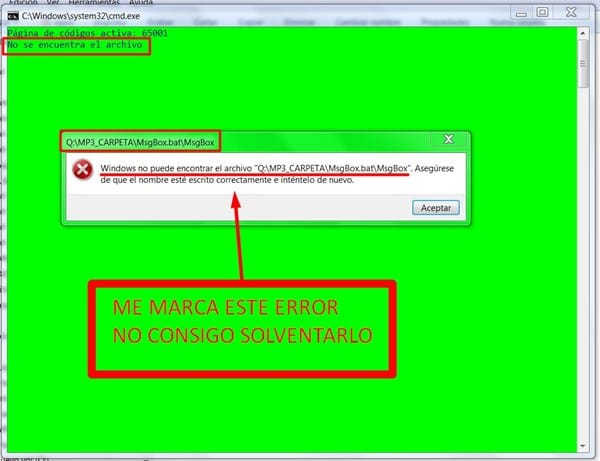 Pero deduzco que, sin modificar el MsgBox.bat, sale la ventana correcta, la de fondo verde (¿por qué en fondo verde, por cierto?). Lo sorprendente es que ese bat solo "escribe" en la ventana de comando (comando ECHO) y lo único que hace, aparte de eso, es un comando MODE CON. Podría ser que fuera el MODE CON, pero entonces, en el MsgBox.bat modificado debería salir el mensaje "Antes del MODE" antes del mensaje de error.