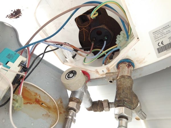 Después de varios años sin problemas un termo eléctrico gotea de manera continua en su base. Justo de la zona del cableado de las resistencias. Nunca se le ha cambiado el ánodo. No puedo ver el sitio exacto porque se filtra a través del aislante de poliuretano, pero es la zona junto a la salida del cable de toma de tierra.