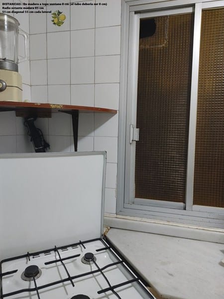 Hola. Mi cocina es así y no tengo ganas de mucha reforma porque el piso no es del todo mio ... Así que no quiero tocar mucho ... Está colocada como veis en diagonal y con una balda de madera en forma de 1/4 de circunferencia que mide 85 de radio, 55 de tamaño en cada lateral y 51 cm de diagonal desde donde se ven las maderas al fondo y no tengo ganas de hacer mucha reforma. Querría, eso si, algo para poner que extraiga el humo aunque no sea al 100 % lo mejor, pero que si que haga un apaño y me reduzca la cantidad de grasa que se forma al cocinar...