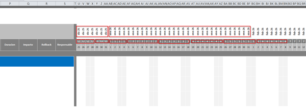 Tengo una Carta GANTT con los días en una fila, las semanas en otra fila y el mes en otra fila. Para poder automatizarlo he puesto en cada celda de la semana o mes, una fórmula. Lo que necesito es que cuando clique en un botón se unan todas las celdas, tanto de la fila semana como de la fila mes, que estén seguidas y sean iguales (es posible que haya semana 23 de distintos años, por eso necesito que una solamente las celdas que están seguidas, ya que está ordenado). El objetivo es tener la fila días con los 7 días y encima estará la fila semana con un único número agrupando las 7 celdas y encima estará el valor único de la fila del mes agrupando las 30 o 31 celdas correspondientes. Adjunto un pantallazo de lo que tengo ahora mismo y pongo en rojo lo que necesito que sea agrupado de forma automática con alguna macro, dejando un único valor. También me gustaría contar con otro botón para desagrupar, es decir el mismo proceso pero al revés, volviendo a lo que tenía antes.