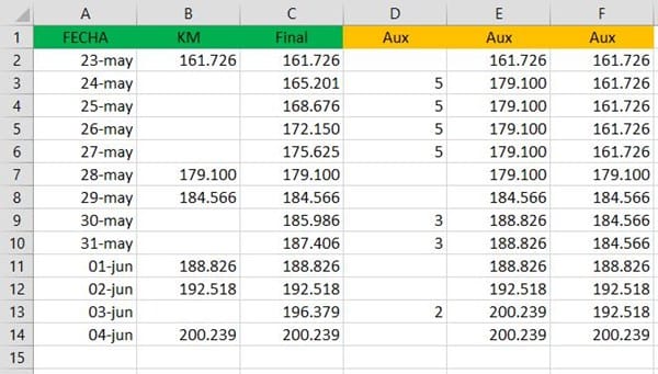 Te comento, tengo una hoja excel en donde la primera columna (A) son fechas y la segunda (B)son km. El problema es que tengo fechas que no tienen km, necesitarías simular que km hay en las fechas que no tienen km en función de la fecha siguiente que si los tiene, suponiendo que cada día se han hecho los mismos kilómetros entre 2 fechas.