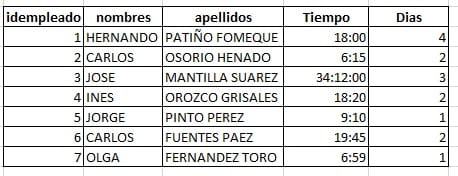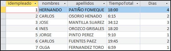 Calcula el tiempo por cada día. Utilizo la función Suma() para sumar los diferentes tiempos. El resultado de esta suma se convierte en horas y minutos con la función.