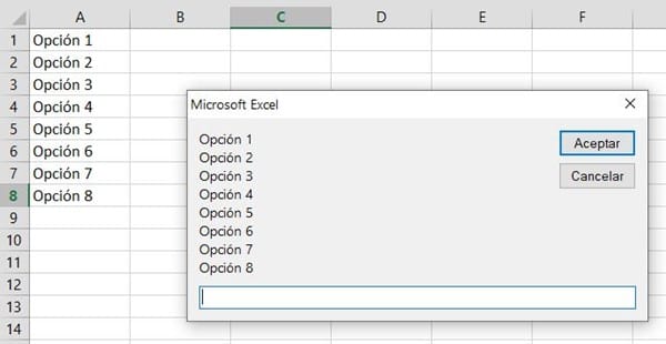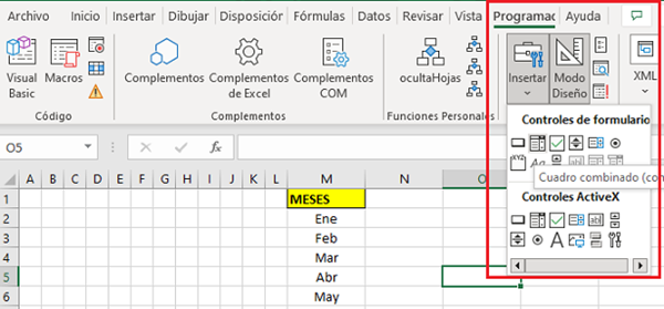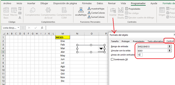 3- Desde la pestaña 'Control' rellena los campos según tu hoja. Necesitarás dejar el resultado de la selección en alguna celda. En mi ejemplo es O1. Ajusta el número en el campo 'Líneas', como mi rango son meses dejé 12.